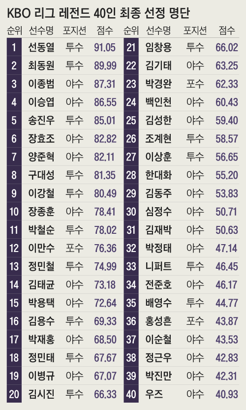 KBO는 올해 출범 40주년을 맞아 팬 및 전문가 투표를 거쳐 KBO 리그를 빛낸 '레전드 40인'을 선정했다.