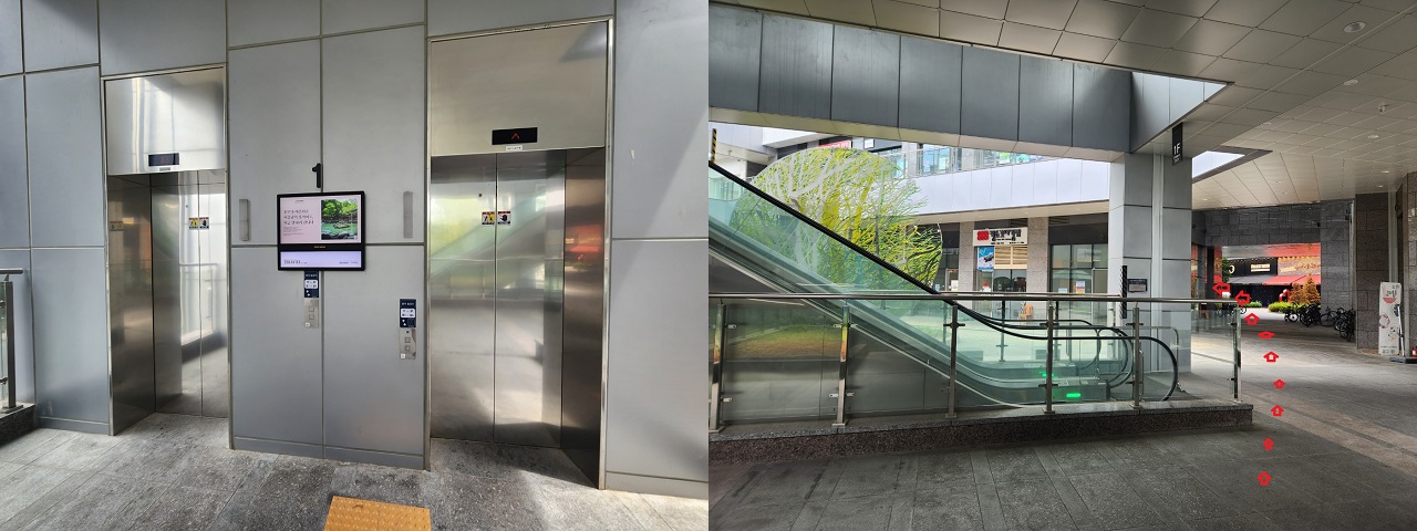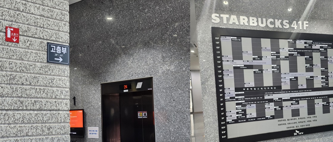 건물 안에 들어서면 저층부, 고층부 엘리베이터가 있고