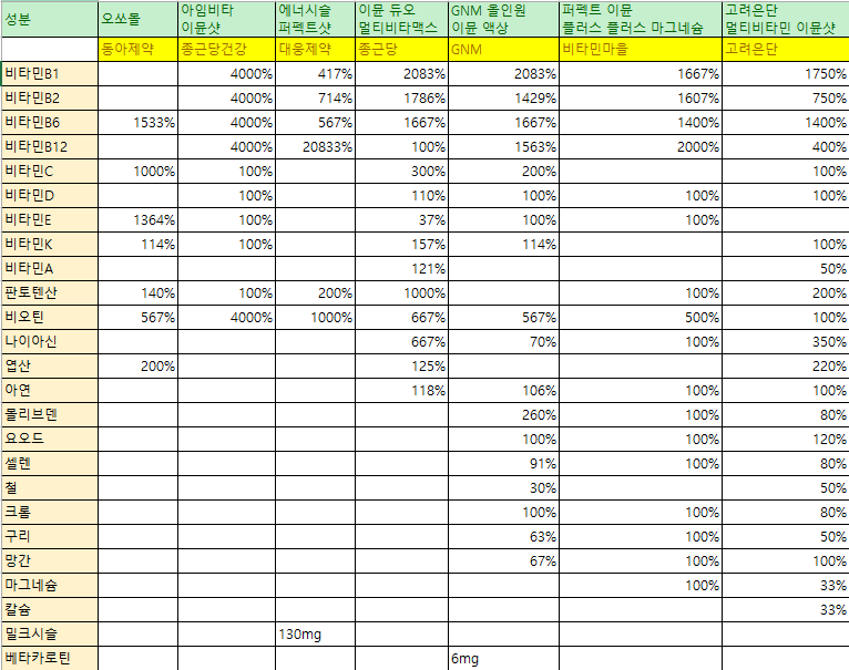이뮨비타민 비교한 엑셀표에서 보시면 아시겠지만